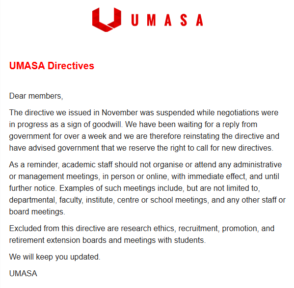 Arnold Cassola, leader of Momentum, said, “UMASA has made it clear that it suspended its directives in good faith while negotiations were ongoing, only to be met with a lack of response from the government. The reinstatement of directives is not the cause of the problem, but a symptom of a failure to engage seriously and respectfully with academic staff.”